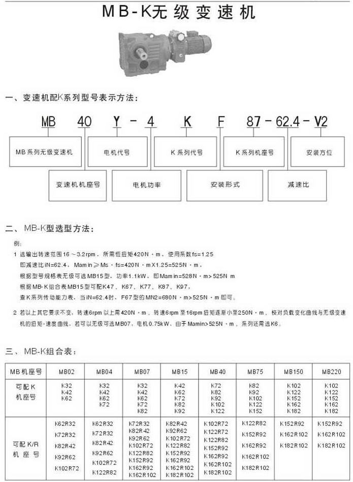 MB-K無級(jí)變速機(jī)型號(hào)表示法選型方法MB-K組合表